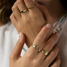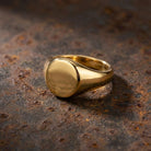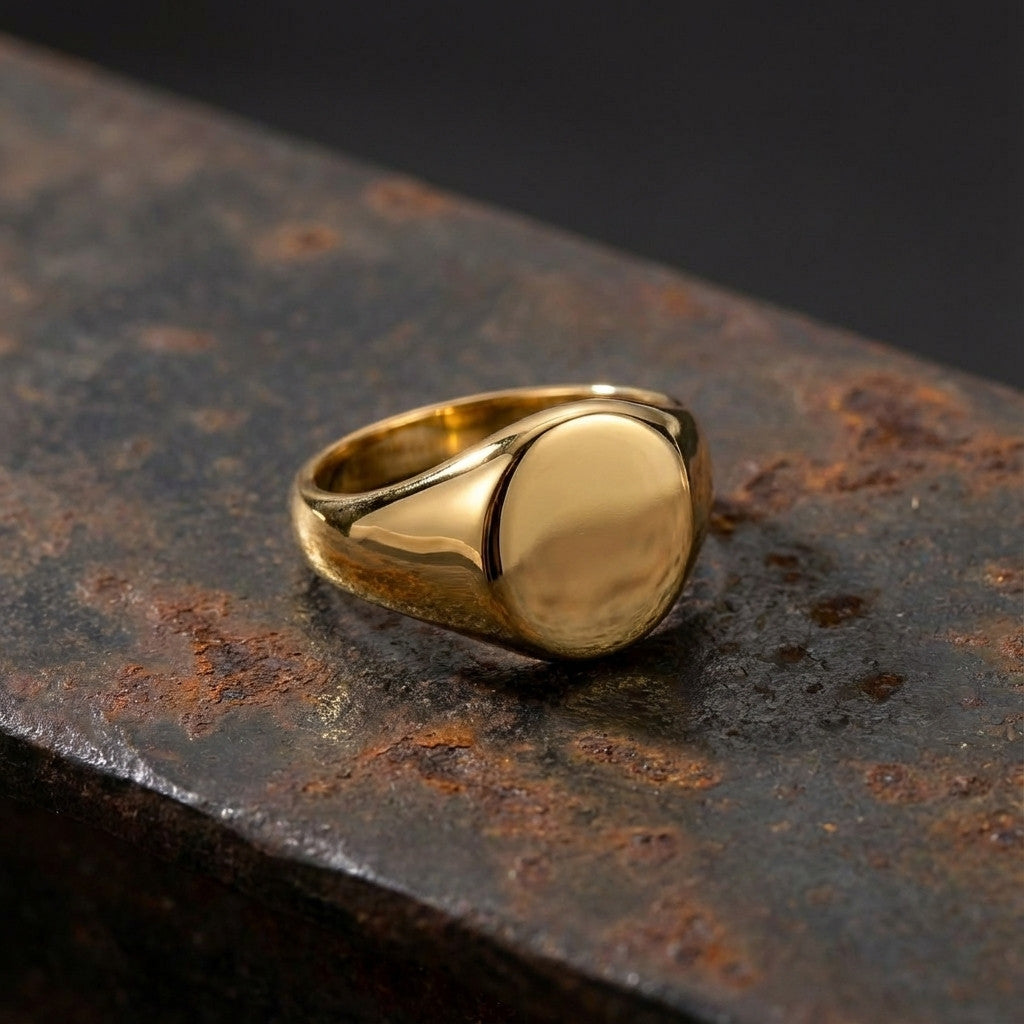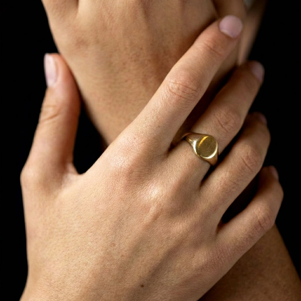 טבעת חותם עגולה, סימטרית ורכה למראה, בעיצוב נקי ועל-זמני. העיגול הקלאסי יושב בעדינות על האצבע ויוצר מראה מאוזן ואלגנטי – מושלמת לאצבע הקמיצה אך מתאימה גם לאצבע המורה או האמה.