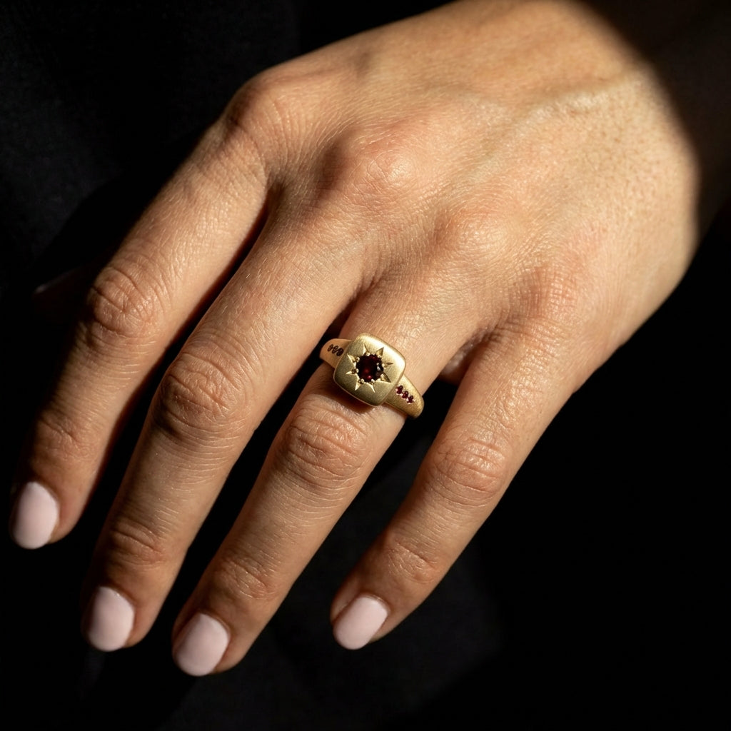 במרכז הריבוע משובצת אבן בקוטר כ-3 מ״מ בשיבוץ כוכב קלאסי, ולצידה שלוש אבנים קטנות בכל צד ליצירת קומפוזיציה הרמונית. ניתן לבחור את סוג האבנים ולהתאים את הטבעת לסגנון אישי, עדין או דרמטי.