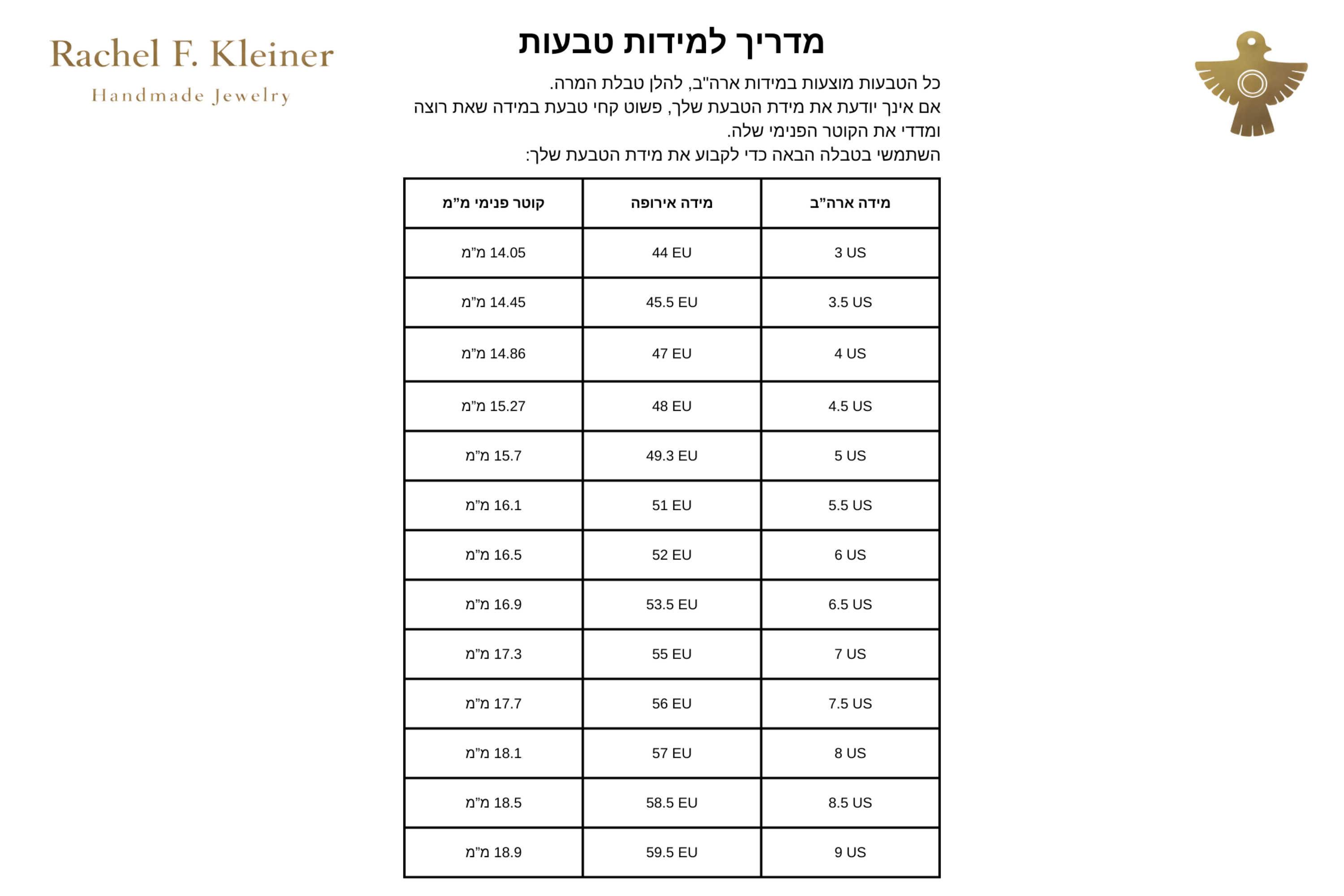 • מידות הטבעת: מגיעה במידות אמריקאיות 4 עד 10, ניתן להיעזר בטבלת המידות, המצורפת או לפנות אלי לעזרה