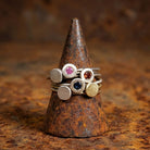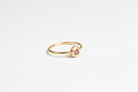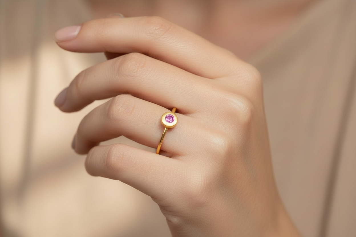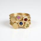 טבעת עדינה ואלגנטית עשויה זהב 14K, בעיצוב מינימליסטי ועל־זמני, עם דיסק עגול משובץ אבן חן קטנה.
