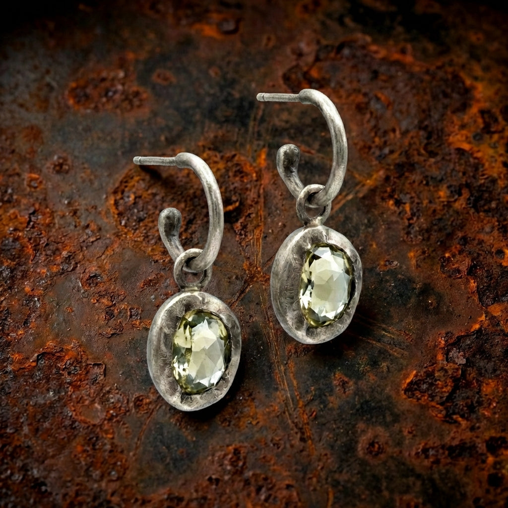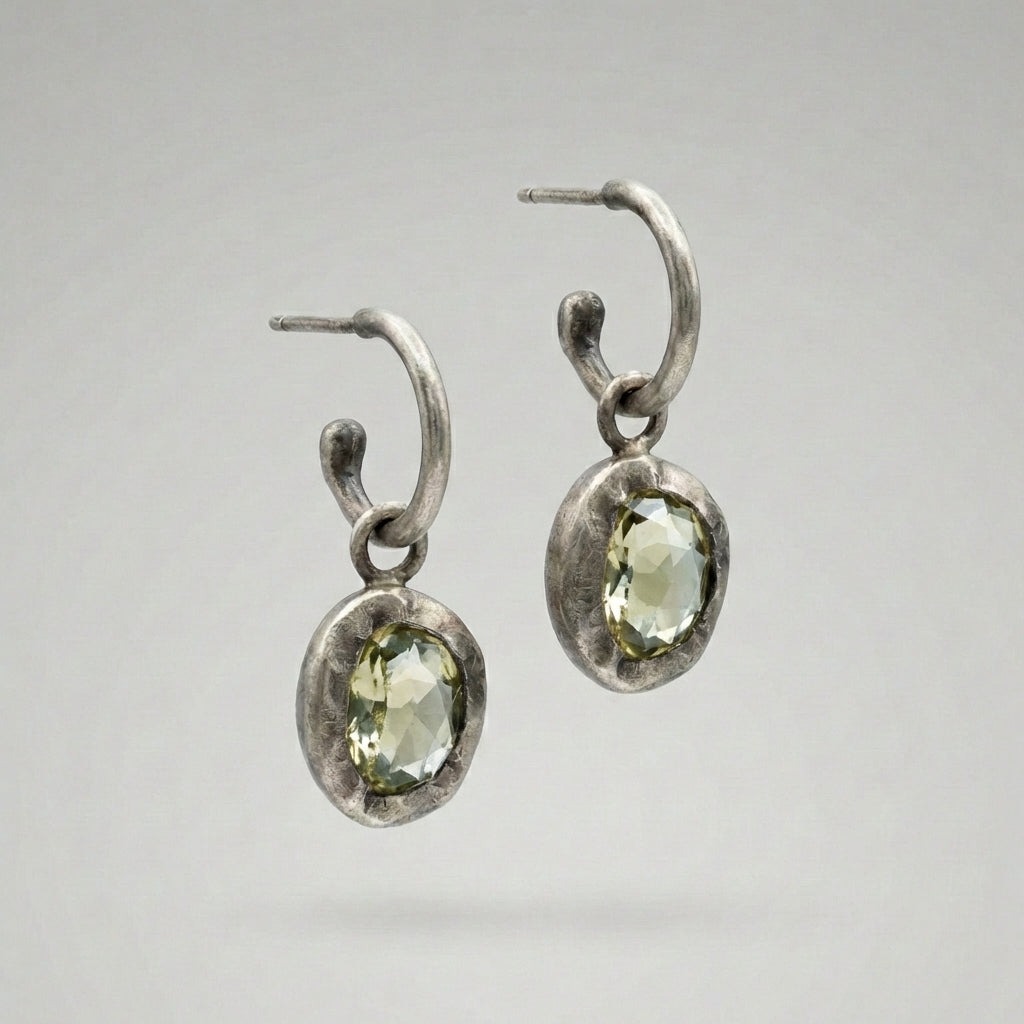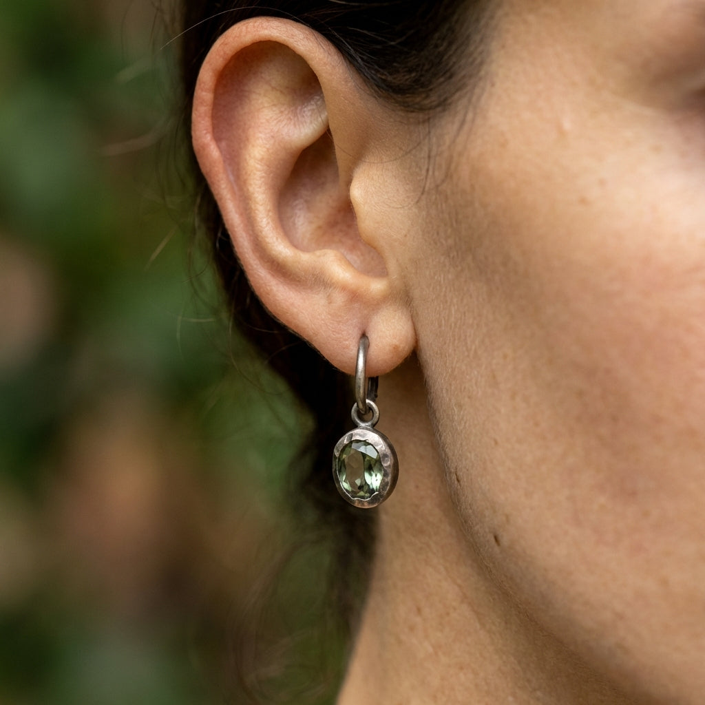 עגילים עדינים ובעלי נוכחות שקטה, עשויים כסף 925 מושחר בעבודת יד, העוטף אבן כרום טופז אובלית בגוון ירקרק-עמוק (בתמונות, או לחילופין אבן סיטרין ירוקה).