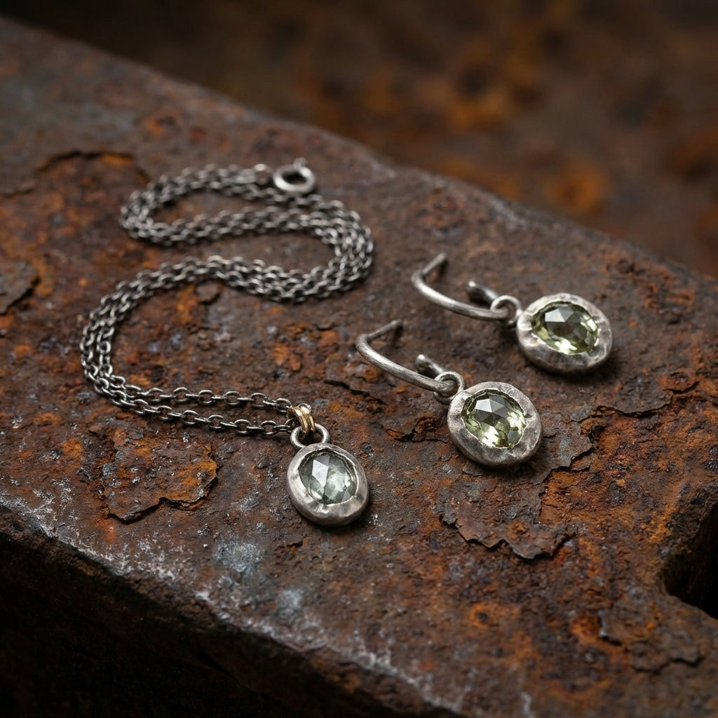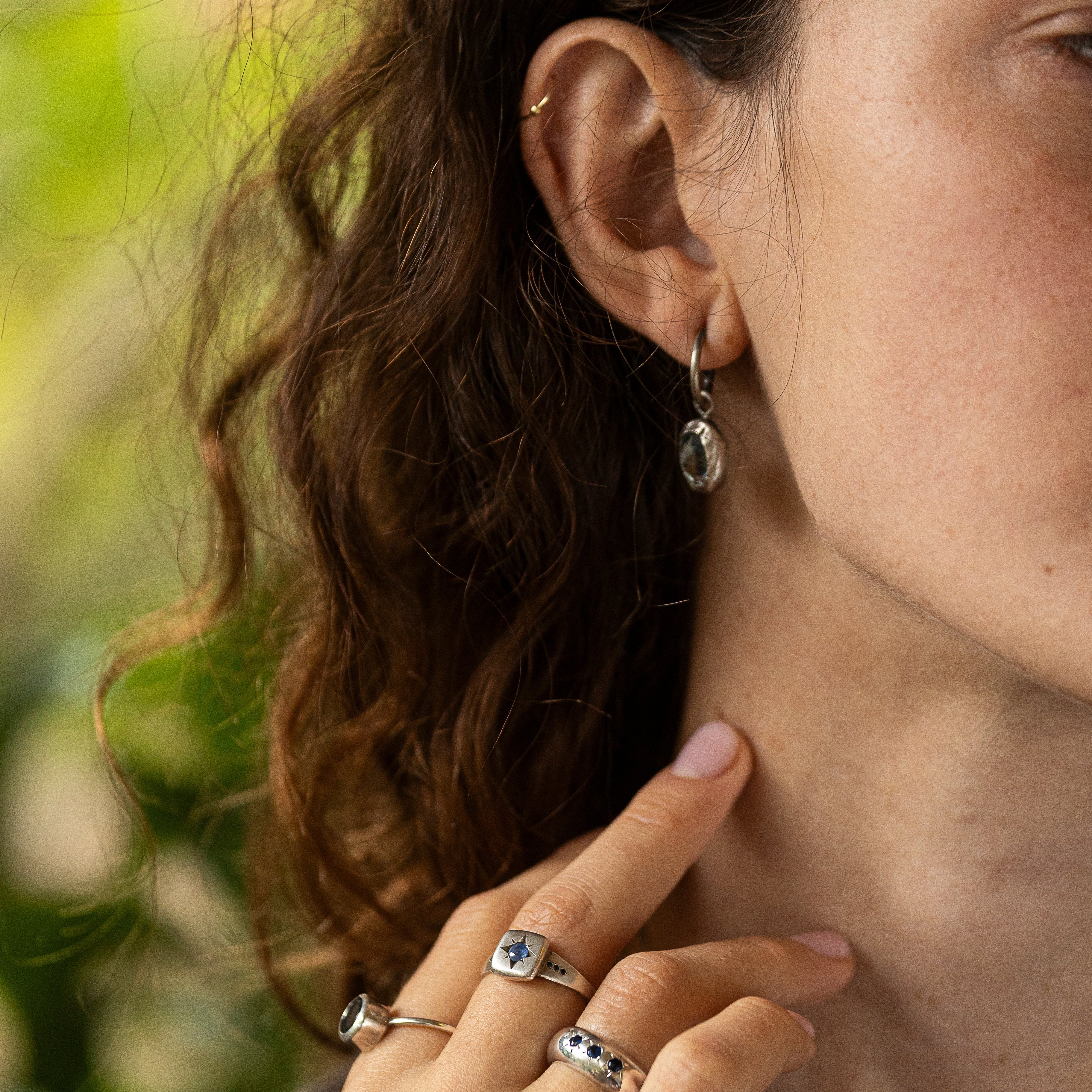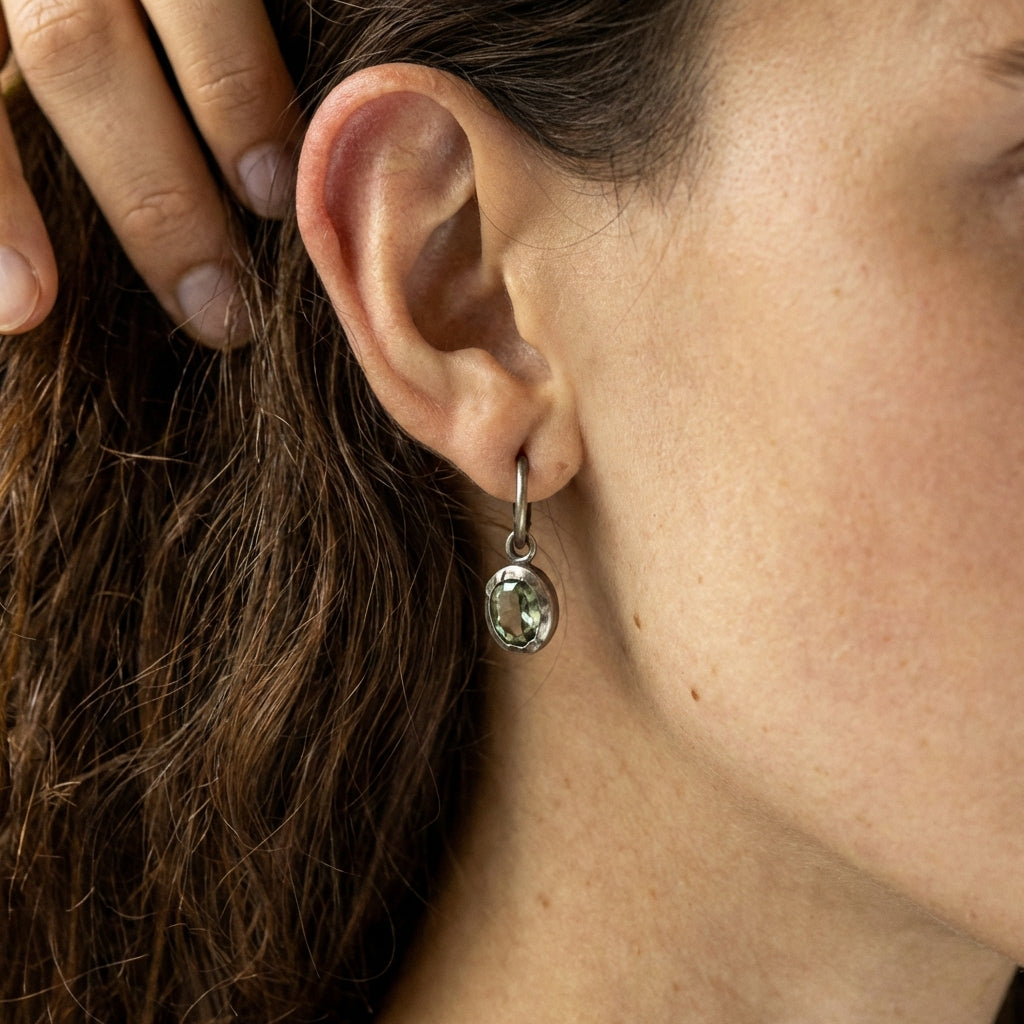 השיבוץ הלא-מהוקצע יוצר מראה טבעי, גולמי ואורגני, כאילו האבן נטמעה בתוך המתכת. האבן תלויה מתחת לעגיל לולאה קלאסי, מה שמעניק תנועה רכה ומחמיאה לפנים.