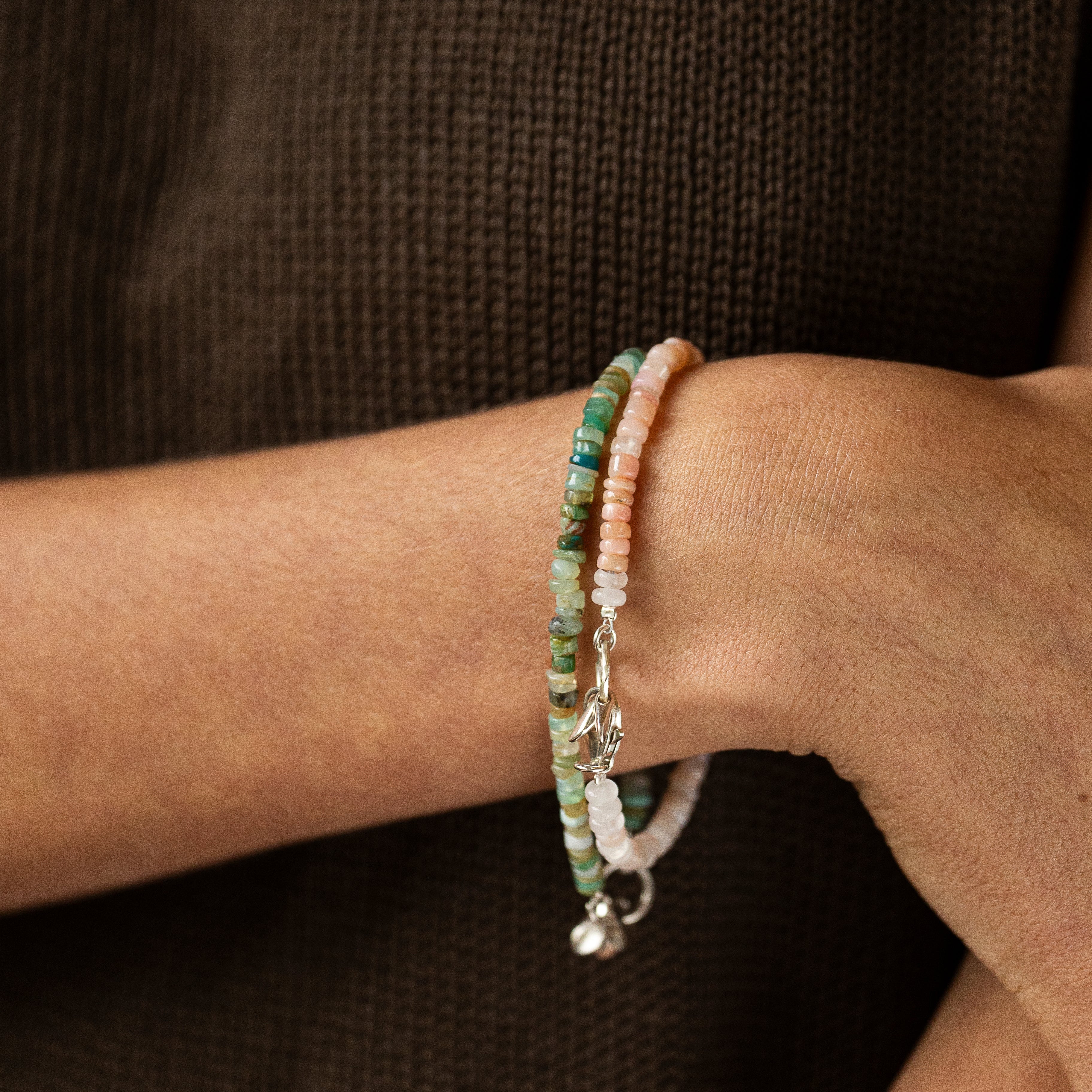 צמיד עדין ואלגנטי מאבני אופל פרואני ורוד עדין ויפהפה, בגוונים משתנים של ורוד ומראה רך ונעים. שילוב האבנים יוצר תחושת זרימה טבעית ועדינה, שמתאימה לענידה יומיומית ולשילוב עם צמידים נוספים.