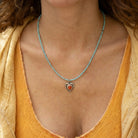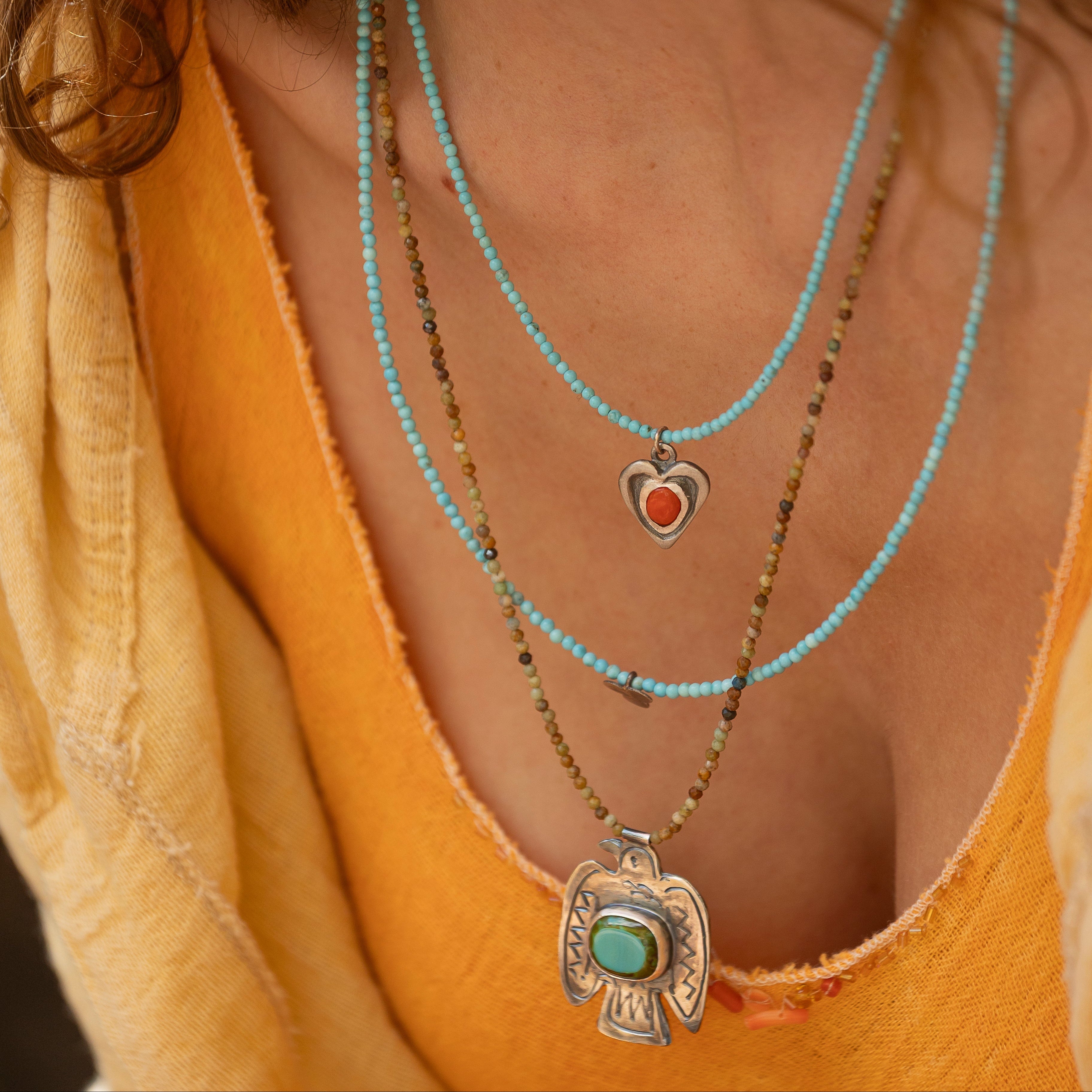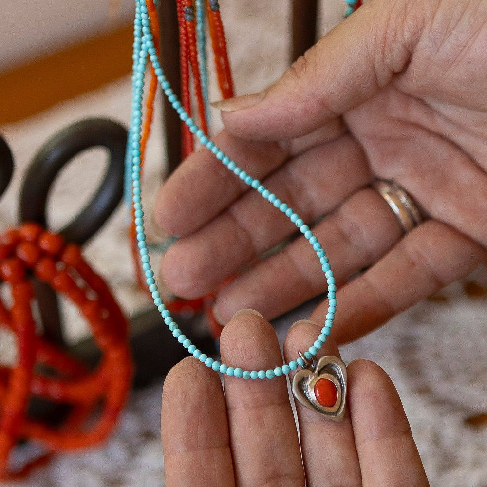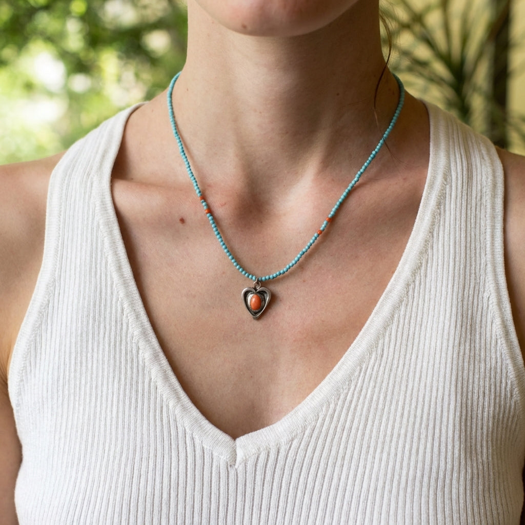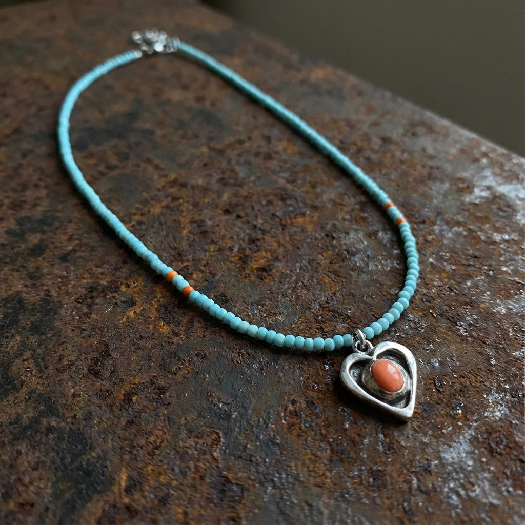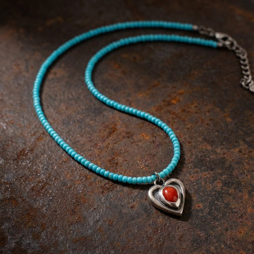 • שרשרת טורקיזים עם לב משובץ קוראל אדום-ורוד