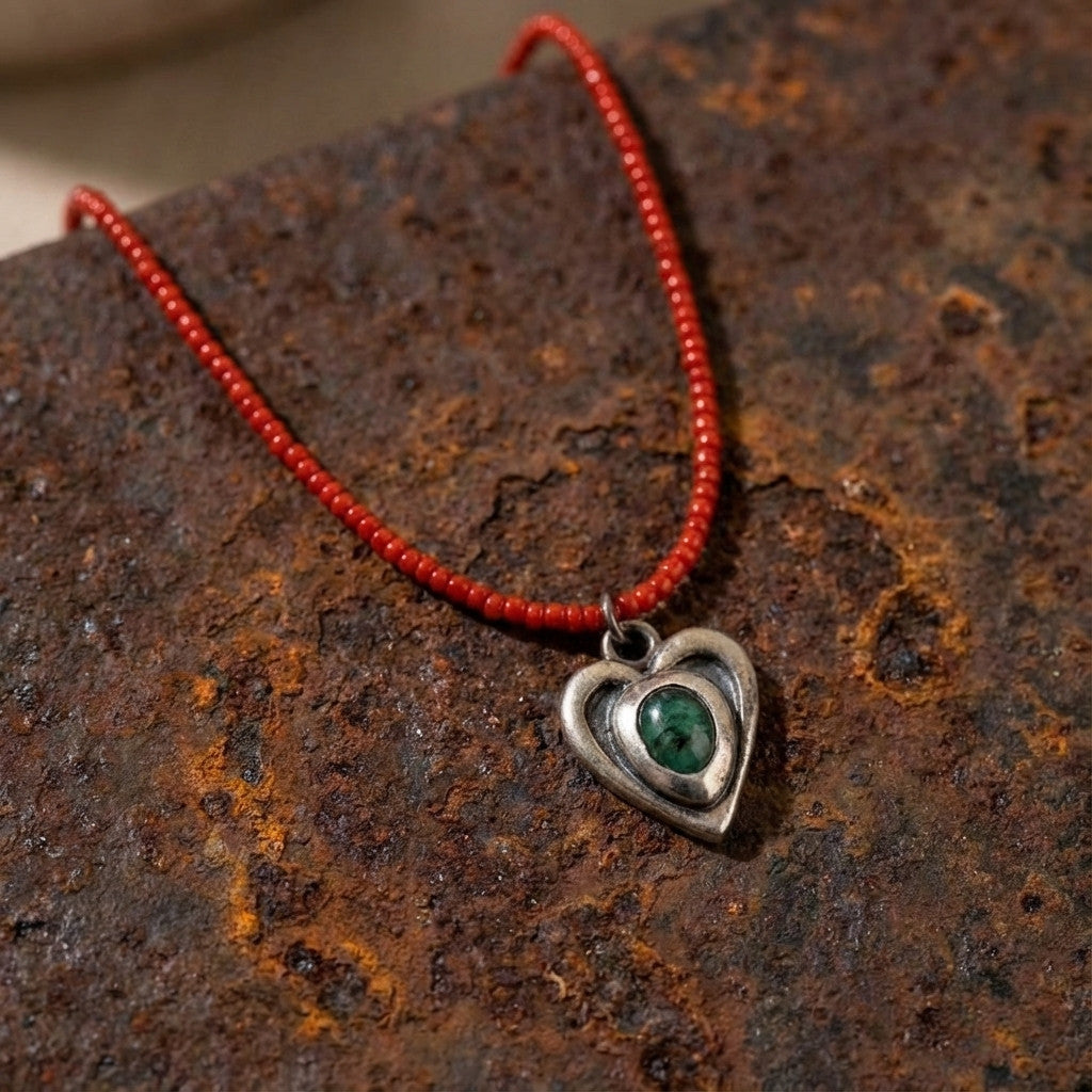 • שרשרת קוראלים אדומים עם לב משובץ אבן אילת