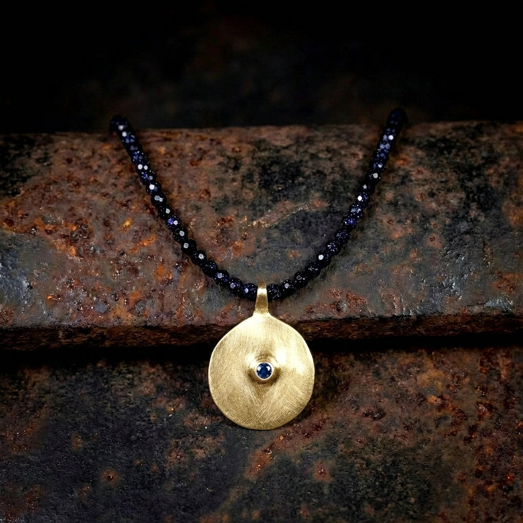 שרשרת אבני חן בלו-סנדסטון בצבע כחול עמוק ותליון זהב 14K – שילוב מרשים, ייחודי, עם נוכחות. אבני החן הטבעיות יוצרות משחק צבעים חי ועדין, שמאיר את הפנים ומתאים ליום-יום וגם לערב.