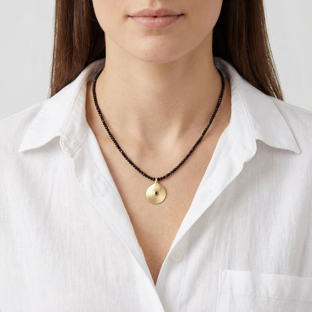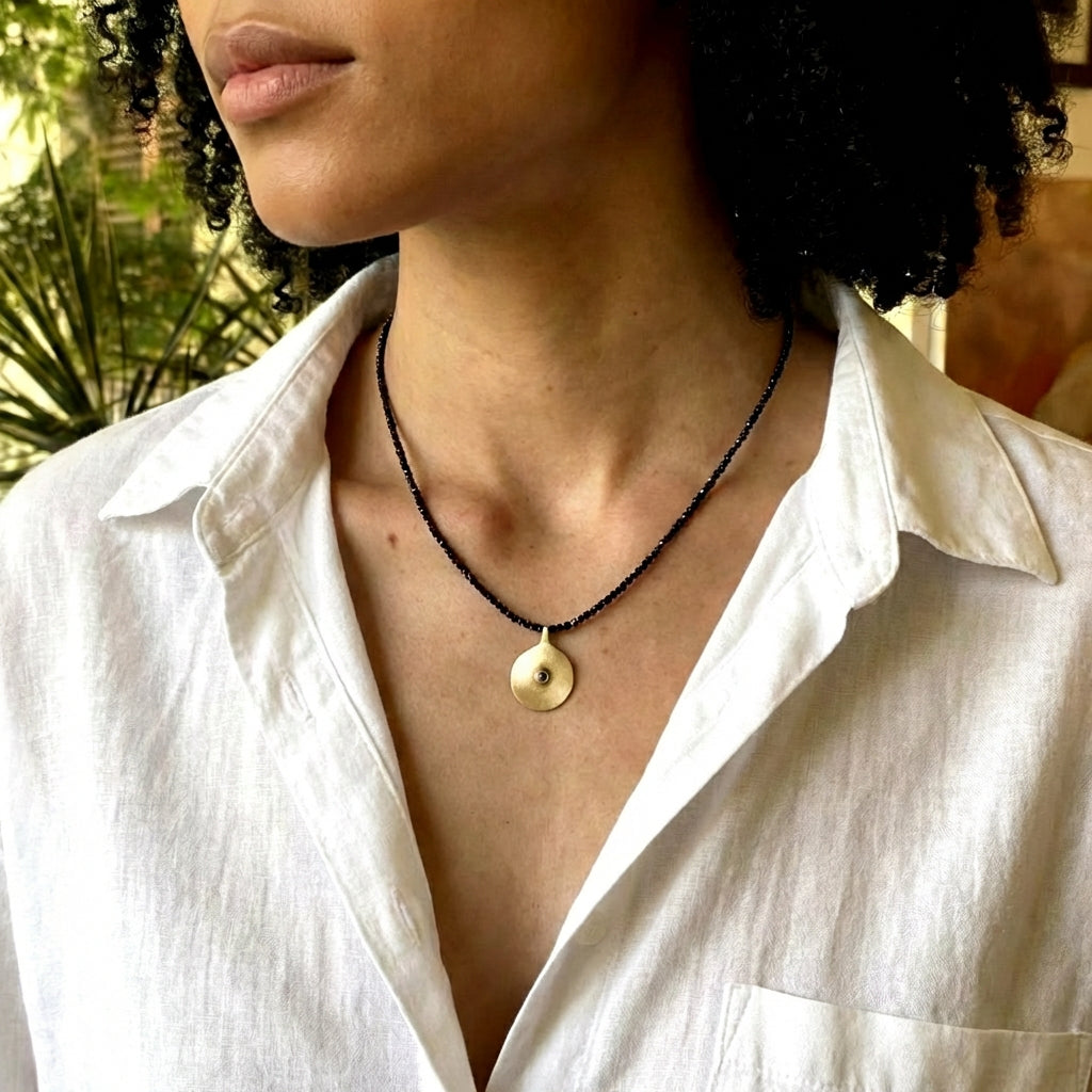 התליון הא-סימטרי מעניק מראה אורגני ולא מלוטש, בשיבוץ אבן ספיר במרכזו, עם תחושה טבעית ואותנטית. כל תליון מיוצר בגימור ידני, כך שכל פריט מעט שונה ומיוחד.